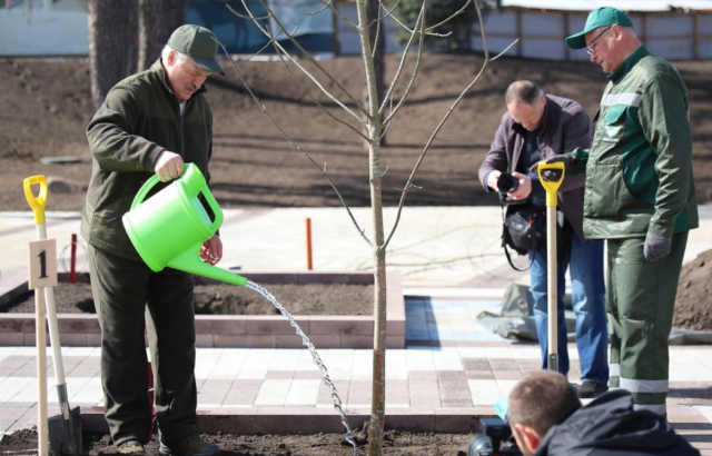 Президент Белоруссии Александр Лукашенко 18 апреля принял участие в республиканском субботнике, где вместе с младшим сыном Николаем Лукашенко занимался посадкой деревьев.